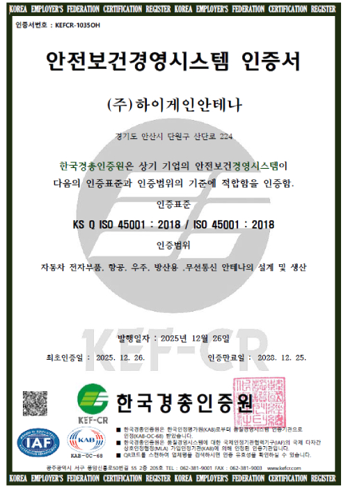 발급처 : IAF 발급일 : 25-12-26 ~ 28-12-25 인증서 : ISO 45001:2018 / 안전보건경영시스템 인증서